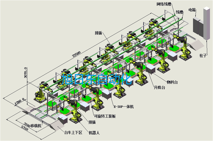 此B超設備裝配初期比較低,裝配后期又比較高,所以此方案采用了各工位分段獨立輸送且每工位均可單獨升降的方案。為保證產品裝配到高位時方便作業本方案采用了雙列皮帶輸送結構以便承載面可以降至較低為置。考慮到后續升級經量大到無人化生產,此方案...